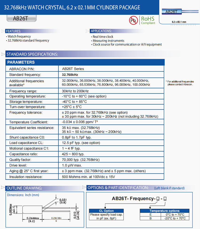| AB26T-32.768KHZ | Abracon | AB26T | 32.768 kHz | ±20ppm | 12.5 pF | |