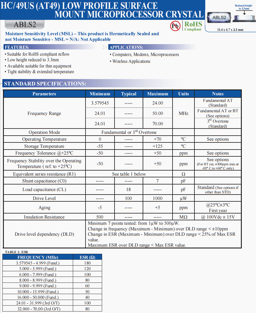 | ABLS2-18.432MHZ-D4Y-T | Abracon | ABLS2 | 18.432 MHz | ±30ppm | ±30ppm | 18 pF |
