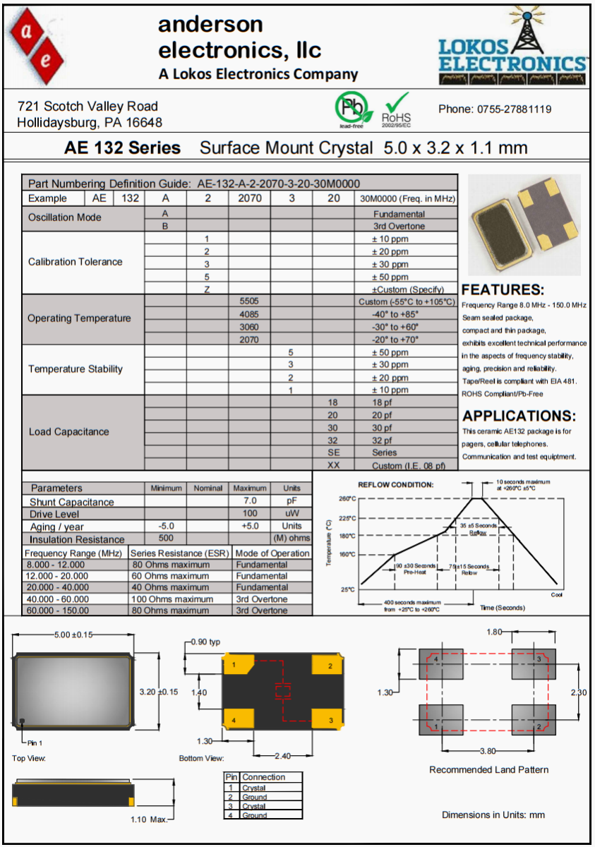 6G移動通訊晶振,Anderson高品質晶體,AE-132-A-2-2070-3-20-30M0000晶振,美國Anderson晶振公司,安德森晶振,進口晶振,AE-132晶振,無源晶振,貼片晶振,超小型晶振,2016晶振,6G通訊設備晶振,6G路由器晶振,6G網(wǎng)絡終端晶振,無源晶振,貼片晶振,無人機晶振,汽車輔助駕駛晶振,低損耗晶振,高品質晶振。產(chǎn)品具有高精度超小型的表面貼片型石英晶體振蕩器,最適用于移動通信終端的基準時鐘等移動通信領域.比如智能手機,無線通信,衛(wèi)星導航,平臺基站等較高端的數(shù)碼產(chǎn)品,晶振本身小型,薄型具備各類移動通信的基準時鐘源用頻率,貼片晶振具有優(yōu)良的電氣特性,耐環(huán)境性能適用于移動通信領域,滿足無鉛焊接的高溫回流溫度曲線要求,符合RoHS/無鉛。