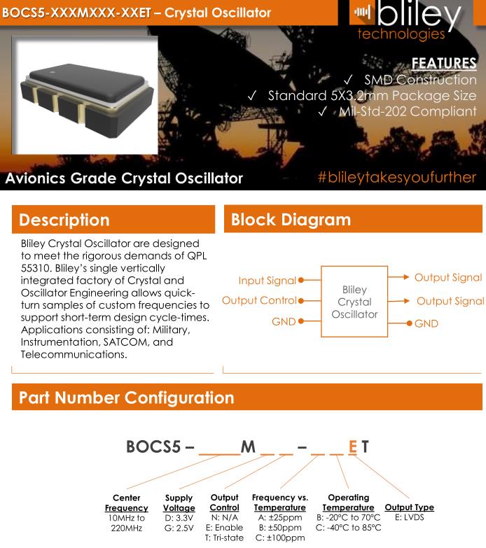 百利晶振,BOCS5晶振,BOCS5-26.000MDE-ACET晶振,5032mm體積的石英晶體振蕩器,有源晶振,該產(chǎn)品可驅(qū)動2.5V的溫補晶振,壓控晶振,VC-TCXO晶體振蕩器產(chǎn)品,電源電壓的低電耗型,編帶包裝方式,可對應(yīng)自動高速貼片機自動焊接,及IR回流焊接(無鉛對應(yīng)),為無鉛產(chǎn)品,超小型,質(zhì)地輕.產(chǎn)品被廣泛應(yīng)用到集成電路,程控交換系統(tǒng),無線發(fā)射基站.Bliley Technologies Inc. 最初于 1930 年作為 Bliley Piezo-Electric Company 成立。最初,我們?yōu)闃I(yè)余無線電市場制造石英晶體。在 1930 年代中期,我們的客戶和產(chǎn)品很快擴大到與新興的軍事和商業(yè)通信領(lǐng)域的利益相匹配,我們的名稱更名為 Bliley Electric Company。1939 年,我們是最大的水晶公司,擁有 11 名員工。