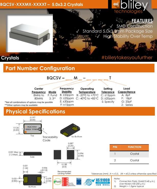 Bliley晶振,BQCSV晶振,BQCSV-20.000M-FBDGT晶振,智能手機晶振,產品具有高精度超小型的表面貼片型石英晶體振蕩器,最適用于移動通信終端的基準時鐘等移動通信領域.比如智能手機,無線通信,衛星導航,平臺基站等較高端的數碼產品,晶振本身小型,薄型具備各類移動通信的基準時鐘源用頻率,貼片晶振具有優良的電氣特性,耐環境性能適用于移動通信領域,滿足無鉛焊接的高溫回流溫度曲線要求.Bliley晶振公司發展歷史:
