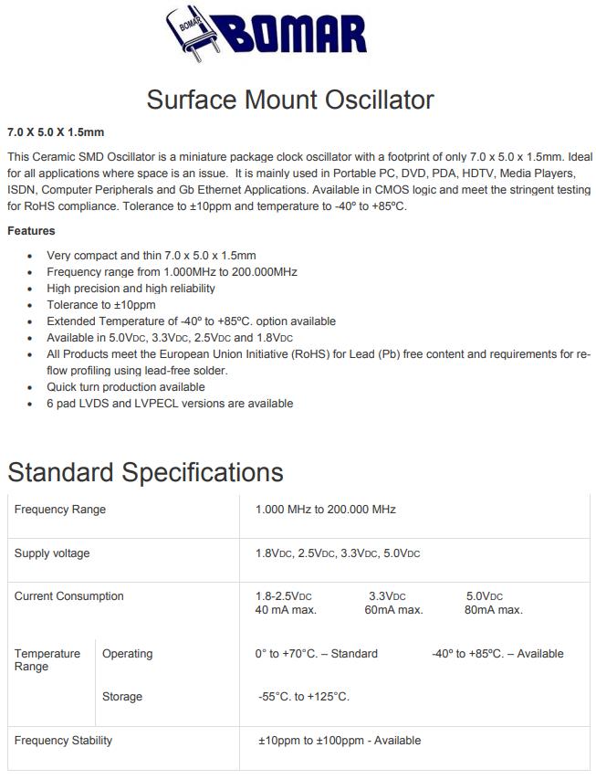 Bomar晶振,B1325-AACS3T-10.000000晶振,時鐘振蕩器,小型SMD有源晶振,從最初超大體積到現在的7050mm,6035mm,5032mm,3225mm,2520mm體積,有著翻天覆地的改變,體積的變小也使產品帶來了更高的穩定性能,接縫密封石英晶體振蕩器,精度高,覆蓋頻率范圍寬的特點,SMD高速自動安裝和高溫回流焊設計,Optionable待機輸出三態輸出功能,電源電壓范圍:1.8V~5V,高穩定性,低抖動,低功耗,主要應用領域:無線通訊,高端智能手機,平板筆記本WLAN,藍牙,數碼相機,DSL和其他IT產品的晶振應用,三態功能,PC和LCDM等高端數碼領域,符合RoHS/無鉛.Bomar成立于 1963 年,是一家為商業和雙向無線電行業生產石英晶體的制造商。該業務的性質要求在寬頻率范圍內具有嚴格的容差和高穩定性晶體,以滿足嚴格的 FCC 規范。快速生產的需求對我們不斷增長的客戶群很重要。我們的許多客戶都是當地、州和聯邦警察和監視機構。Bomar 很快不僅成為該市場的領先供應商,而且因其產品質量、快速周轉時間和無與倫比的客戶服務而獲得一致認可。