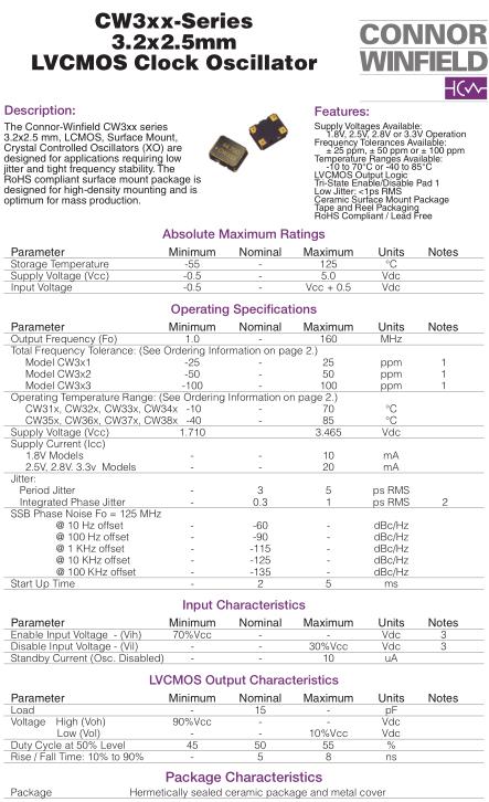 康納溫菲爾德晶振,CW34晶振,CW333-024.000M晶振,小型SMD有源晶振,從最初超大體積到現(xiàn)在的7050mm,6035mm,5032mm,3225mm,2520mm體積,有著翻天覆地的改變,體積的變小也使產(chǎn)品帶來(lái)了更高的穩(wěn)定性能,接縫密封石英晶體振蕩器,精度高,覆蓋頻率范圍寬的特點(diǎn),SMD高速自動(dòng)安裝和高溫回流焊設(shè)計(jì),Optionable待機(jī)輸出三態(tài)輸出功能,電源電壓范圍:1.8V~5V,高穩(wěn)定性,低抖動(dòng),低功耗,主要應(yīng)用領(lǐng)域:無(wú)線通訊,高端智能手機(jī),平板筆記本W(wǎng)LAN,藍(lán)牙,數(shù)碼相機(jī),DSL和其他IT產(chǎn)品的晶振應(yīng)用,三態(tài)功能,PC和LCDM等高端數(shù)碼領(lǐng)域,符合RoHS/無(wú)鉛.