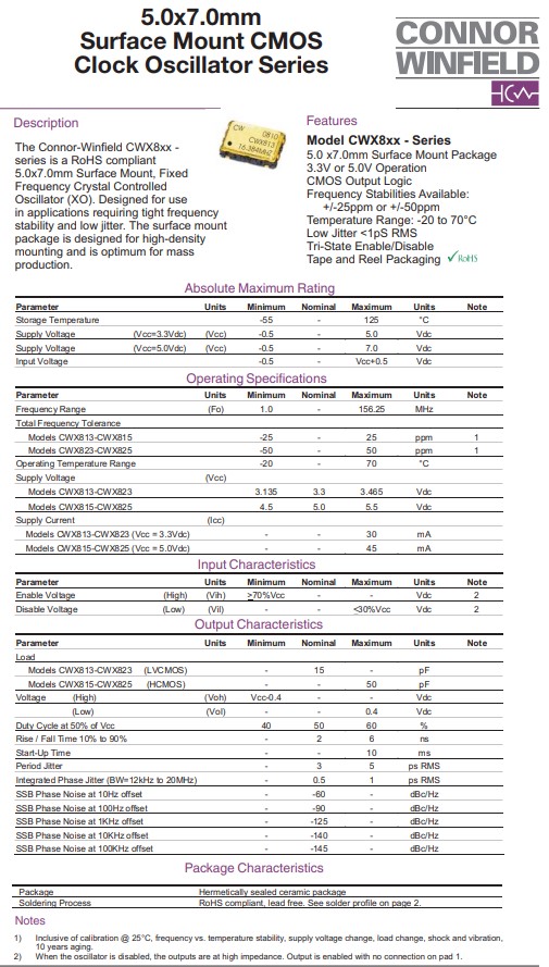 | CWX813-050.0M | ConnorWinfield晶振 | CWX813 | 50MHz | -20°C ~ 70°C |