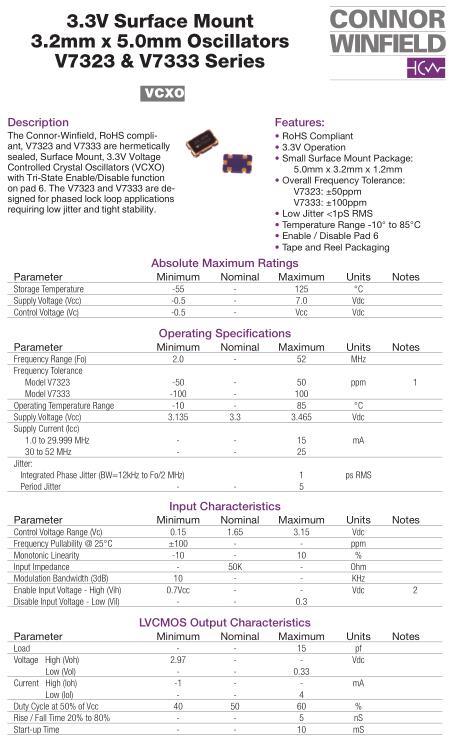 康納溫菲爾德晶振,V7333晶振,V7333-20.00MHz晶振,5032mm體積的石英晶體振蕩器,有源晶振,該產品可驅動2.5V的溫補晶振,壓控晶振,VC-TCXO晶體振蕩器產品,電源電壓的低電耗型,編帶包裝方式,可對應自動高速貼片機自動焊接,及IR回流焊接(無鉛對應),為無鉛產品,超小型,質地輕.產品被廣泛應用到集成電路,程控交換系統,無線發射基站.