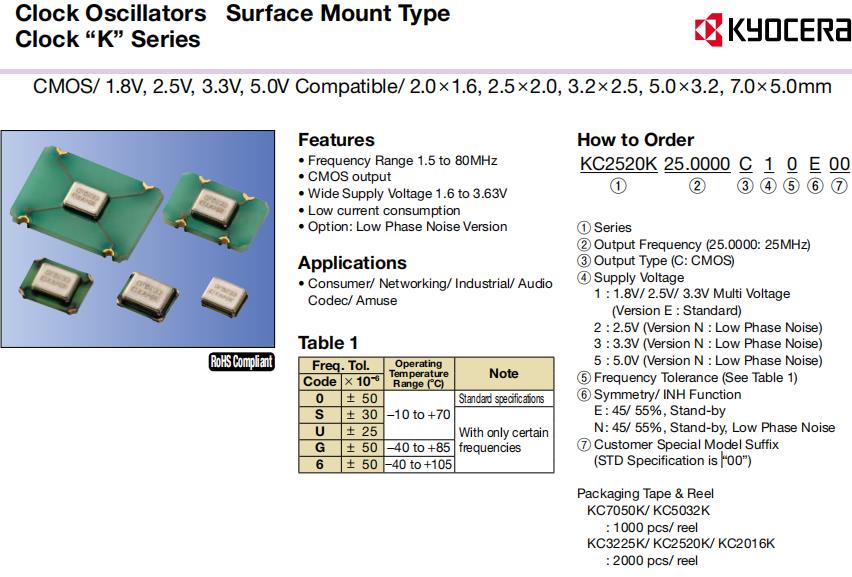 | KC2520K14.3182C1GE00 | Kyocera有源振蕩器 | KC2520K, Kyocera | 14.3182MHz | 1.6 V ~ 3.63 V | -40°C ~ 85°C |