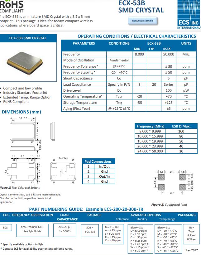 ECS-250-20-30B-TR晶振 參數表| ECS晶振規格 | 單位 | ECX-53B晶振頻率范圍 | 石英晶振基本條件 |