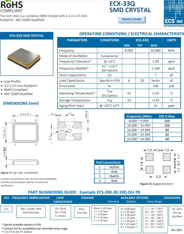 | ECS-250-18-33Q-DS | ECS晶振 | ECX-33Q | 25MHz | -40°C ~ 125°C |