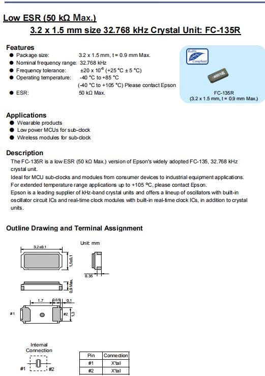 | Q13FC1350003900 | 3.2 x 1.5 x 0.9 mm | FC-135 | 32.768kHz | 7.5 pF | +/-10.0 ppm | -40 to +85 °C |