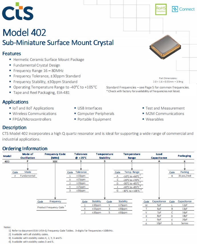 美國進口CTS西迪斯晶振Model 402系列,是一款小體積晶振尺寸2.0x1.6mm超微型表面貼裝石英晶體,四腳貼片晶振,無源晶振,石英晶振,石英晶體諧振器,無鉛環保晶振,頻率范圍:16MHz至80MHz,工作溫度范圍:-40℃至+105℃,具有超小型,輕薄型,耐熱、耐振、耐沖擊等優良的耐環境特性,滿足無鉛焊接的高溫回流溫度曲線要求,符合AEC-Q200標準。貼片晶振應用:物聯網和IIoT應用,無線通信,FPGA/微控制器,USB接口,計算機外圍設備,便攜式設備,測試和測量,M2M通信,可穿戴設備等應用。超小型表面貼裝晶體402F240XXCJR非常適用于便捷式設備應用
