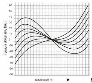 圖2顯示了各種AT切角的一些典型頻率/溫度曲線。頻率隨溫度的變化是非常可預測的,因此可以在溫補晶振(TCXO)中使用晶體元件