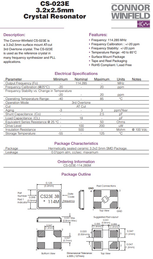 | CS-023-114.285M | ConnorWinfield Crystal | CS-023 | MHz Crystal | 114.285MHz | ±20ppm | 4-SMD, No Lead |