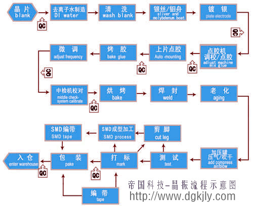 關(guān)于晶振,石英晶振,貼片晶振,32.768K,每天都在重復(fù)客戶和客戶講解著這些產(chǎn)品,原材料晶片到成品入庫(kù),那么你知道在制作過(guò)程中有多少個(gè)程序嗎?有多少個(gè)環(huán)節(jié)是要QC檢驗(yàn)的嗎?一起看看流程示意圖吧!