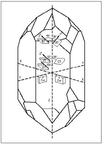 晶片的切割可分為AT-CUT, BT-CUT, CT-CUT, DT-CUT, FT-CUT, XT-CUT, YT-CUT,如圖所示.它是以光軸(Z軸)為參考而命名,每種切法對(duì)應(yīng)一個(gè)角度.采用何種切法應(yīng)根據(jù)實(shí)際情況而定,如對(duì)溫度特性要求較好則應(yīng)采用AT-CUT,如果對(duì)晶振要求的頻率較高時(shí)則采用BT-CUT.晶片的切割方式、幾何形狀、尺寸等決定了貼片晶振的頻率.(你知道嗎?)