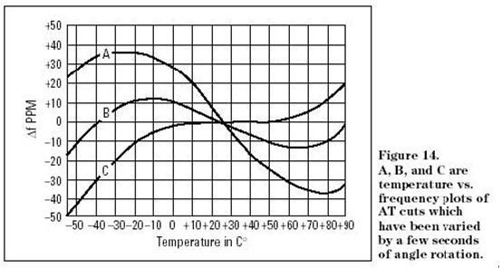 左邊以AT-CUT和BT-CUT為例,比較不同的切割方法對(duì)晶振參數(shù)的影響: AT-Cut: 切割角度:35013’(一般誤差在±3’,其誤差越小其溫度特性越好,) F(K)=1670(K)/t(mm) t為晶片之厚度,一般運(yùn)用,溫度特性較發(fā)好,+/-30PPM BT-Cut: 切割角度:490 F(K)=2560(K)/t(mm) t為晶片之厚度, AT-Cut用于基頻高頻,溫度特性差, +/-100PPM 當(dāng)AT-CUT與BT-CUT頻率一樣時(shí),AT-CUT的本體要比BT-CUT的本體小,其C0,C1,L1也不一樣,如頻率為35MHZ,當(dāng)其面積一樣時(shí),AT-CUT本體的厚度為0.02mm,而BT-CUT的本體厚度為0.073mm. AT-CUT的C0為5.5pf,而BT-CUT的C0為2.7pf. AT-CUT溫度曲線如圖所示,現(xiàn)在我們所用的晶振的中心溫度值一般多為25±3oC,在-10 oC~70 oC這一區(qū)間,其溫度頻差一般為±30PPM,溫度特性較好.