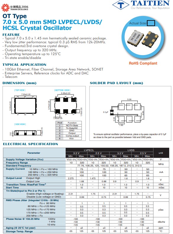 Taitien的OT-M和OW-M系列超低抖動非常適合高速網(wǎng)絡應用,OTETGCLTNF-156.250000,LVPECL差分晶振