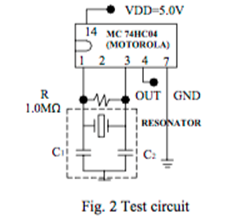 陶瓷諧振器的測試電路陶瓷諧振器:帶內(nèi)置電容器:它由帶有反饋電阻Rf的CMOS反相器組成(圖2).反饋電阻允許在最初施加電源時啟動振蕩.其值通常為1MΩ.Cl和C2的值在表中給出或由客戶指定.