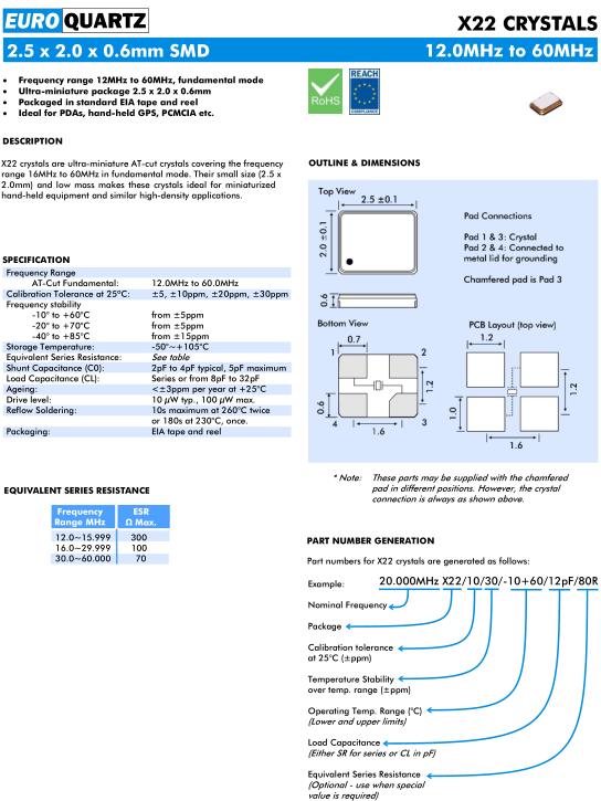 | Euroquartz晶振規(guī)格 | 單位 | X22晶振頻率范圍 | 石英晶振基本條件 |