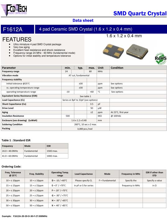FCD-Tech晶振,F1612A晶振,F1612A-2020D30F-26.000MHz晶振,貼片晶振本身體積小,超薄型石英晶體振蕩器,特別適用于有目前高速發(fā)展的高端電子數(shù)碼產(chǎn)品,因為晶振本身小型化需求的市場領(lǐng)域,小型,薄型是對應(yīng)陶瓷振蕩器(偏差大)和普通的石英晶體振蕩器(偏差小)的中間領(lǐng)域的一種性價比較出色的產(chǎn)品.產(chǎn)品廣泛用于筆記本電腦,無線電話,衛(wèi)星導(dǎo)航SSD,USB,Blu-ray等用途,符合無鉛焊接的高溫回流焊曲線特性.FCD-Tech晶振電子元器件廠家重要經(jīng)營的產(chǎn)品范圍有:石英晶體,晶體振蕩器,水晶過濾器,射頻和微波產(chǎn)品,壓電晶體傳感器這些大類產(chǎn)品,今天主要介紹壓電晶體傳感器這一系列元器件產(chǎn)品,使用石英晶體為監(jiān)控測試設(shè)備進(jìn)行高精度的測量,溫度,質(zhì)量,同時為其提供高性能的準(zhǔn)確導(dǎo)航定位