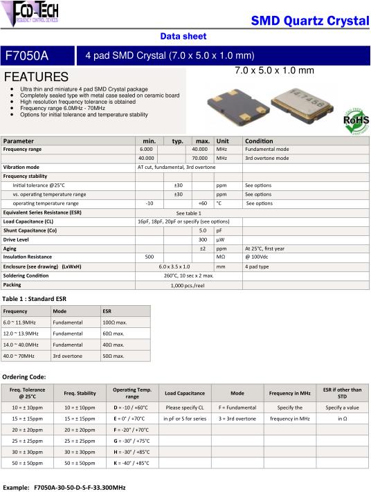 用于JEDEC J-STD-020D.01回流條件的耐熱可用性需個(gè)別判斷。請聯(lián)系我們以便獲取相關(guān)信息。FCD-Tech晶振,F7050A晶振,F7050A-3050DSF-26.000MHz晶振.