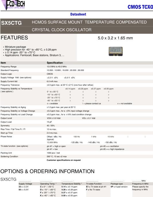 FCD-Tech晶振,SX5CTG晶振,SX5CTG-33K0.28E14P-12.000MHz晶振,5032mm體積的石英晶體振蕩器,有源晶振,該產(chǎn)品可驅(qū)動(dòng)2.5V的溫補(bǔ)晶振,壓控晶振,VC-TCXO晶體振蕩器產(chǎn)品,電源電壓的低電耗型,編帶包裝方式,可對(duì)應(yīng)自動(dòng)高速貼片機(jī)自動(dòng)焊接,及IR回流焊接(無鉛對(duì)應(yīng)),為無鉛產(chǎn)品,超小型,質(zhì)地輕.產(chǎn)品被廣泛應(yīng)用到集成電路,程控交換系統(tǒng),無線發(fā)射基站.