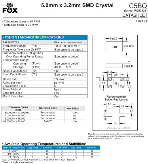 | FOX晶振規(guī)格 | 單位 | C5BQ晶振頻率范圍 | 石英晶振基本條件 | |