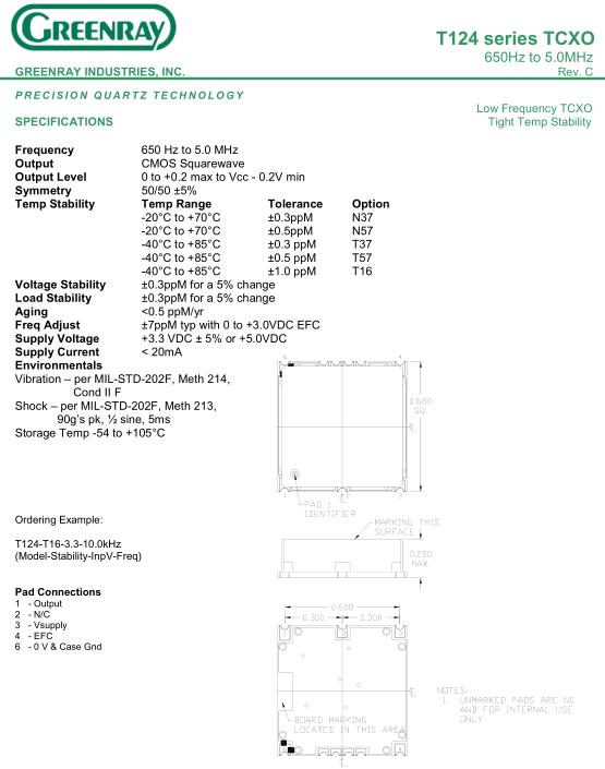 格林雷晶振,T124晶振,T124-T16-3.3-10.0kHz晶振,溫補晶振(TCXO)產品本身具有溫度補償作用,高低溫度穩定性:頻率精度高0.5PPM-2.0PPM,工作溫度范圍:-30度至85度,電源電壓:1.8V-3.3V之間可供選擇,產品本身具有溫度電壓控制功能,世界上最薄的晶振封裝,頻率:26兆赫,33.6兆赫,38.4兆赫,40兆赫,因產品性能穩定,精度高等優勢,被廣泛應用到一些比較高端的數碼通訊產品領域,GPS全球定位系統,智能手機,WiMAX和蜂窩和無線通信等產品,符合RoHS/無鉛.Greenray格林雷晶振集團所生產的石英晶振,貼片晶振,石英晶體振蕩器工作溫度范圍較廣在-55+125°C之間,Greenray格林雷OCXO晶體振蕩器的頻率穩定度在±0.005ppm較高精度,TCXO溫補晶振的頻率穩定度控制在±0.04ppm范圍的高精度,具有低相位,低抖動,低噪音等特性.