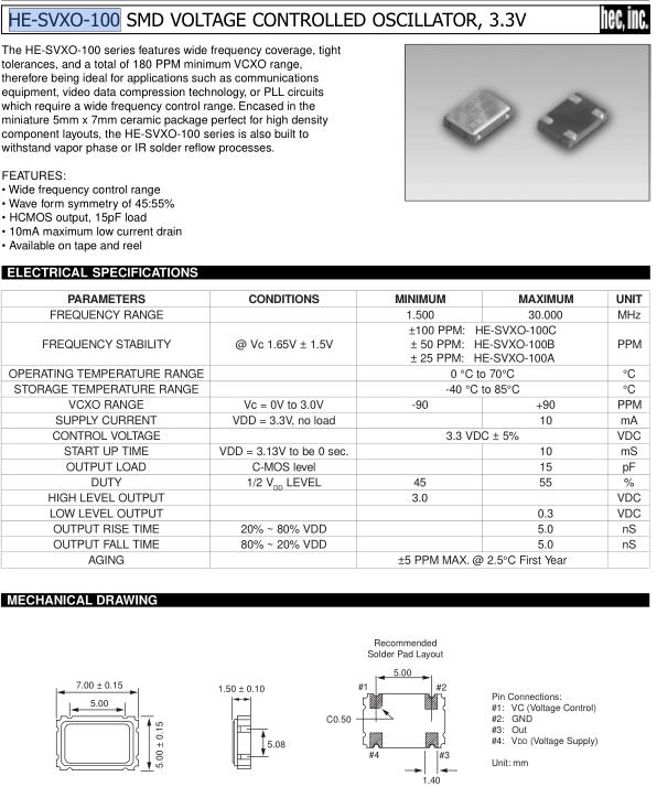 HEC晶振,HE-SVXO-100晶振,VCXO壓控晶振,小型SMD有源晶振,從最初超大體積到現在的7050mm,6035mm,5032mm,3225mm,2520mm體積,有著翻天覆地的改變,體積的變小也使產品帶來了更高的穩定性能,接縫密封石英晶體振蕩器,精度高,覆蓋頻率范圍寬的特點,SMD高速自動安裝和高溫回流焊設計,Optionable待機輸出三態輸出功能,電源電壓范圍:1.8V~5V,高穩定性,低抖動,低功耗,主要應用領域:無線通訊,高端智能手機,平板筆記本WLAN,藍牙,數碼相機,DSL和其他IT產品的晶振應用,三態功能,PC和LCDM等高端數碼領域,符合RoHS/無鉛.HECCrystal是美國知名晶振品牌,生產制造各種HEC晶振,HEC貼片晶體,包括晶體振蕩器系列.HECCrystal除了晶振之外也是射頻和微波產品的重要制造商.
