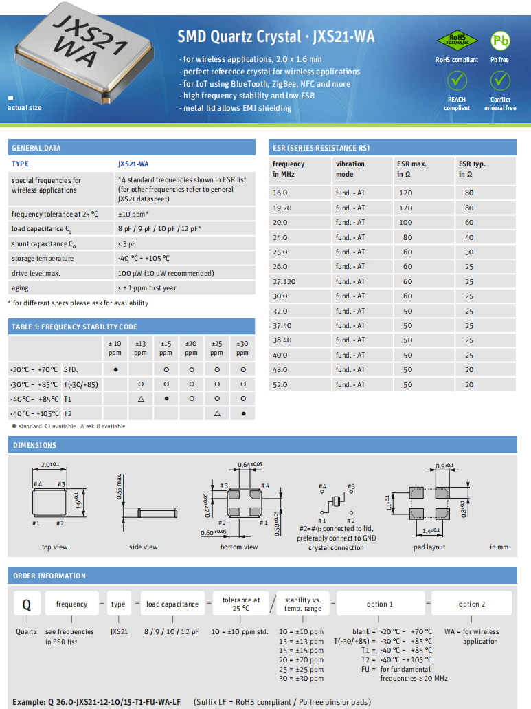 Q 38.4-JXS21-10-10/10-FU-WA-LF,JXS21-WA,Jauch超小型晶振,可穿戴設備晶振,Jauch晶振,法國進口晶振,型號:JXS21-WA,編碼為:Q 38.4-JXS21-10-10/10-FU-WA-LF,頻率:38.400MHz,頻率容差:±10ppm,頻率穩定性:±10ppm,負載電容:10pF,工作溫度范圍:-20℃至+70℃,小體積晶振尺寸:2.0x1.6x0.55mm封裝,四腳貼片晶振,石英晶體諧振器,石英晶振,無源晶振,SMD晶振,2016晶振,石英水晶諧振器。具有超小型,輕薄型,高品質,高性能,高穩定性等特點。應用于:無線應用,藍牙模塊晶振,可穿戴設備晶振,ZigBee、NFC等的物聯網應用。