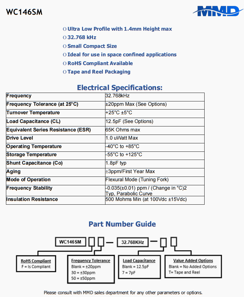 | WC146SMF-32.768KHZ-T | MMD | WC146SM | 32.768 kHz | ±20ppm | 12.5 pF | |