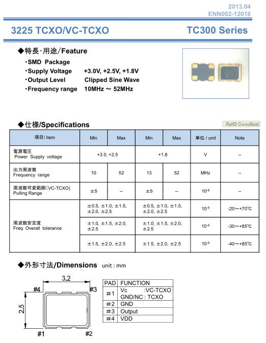 NAKA晶振,TC300晶振,3225mm有源晶振,小型SMD有源晶振,從最初超大體積到現在的7050mm,6035mm,5032mm,3225mm,2520mm體積,有著翻天覆地的改變,體積的變小也使產品帶來了更高的穩定性能,接縫密封石英晶體振蕩器,精度高,覆蓋頻率范圍寬的特點,SMD高速自動安裝和高溫回流焊設計,Optionable待機輸出三態輸出功能,電源電壓范圍:1.8V~5V,高穩定性,低抖動,低功耗,主要應用領域:無線通訊,高端智能手機,平板筆記本WLAN,藍牙,數碼相機,DSL和其他IT產品的晶振應用,三態功能,PC和LCDM等高端數碼領域,符合RoHS/無鉛.
