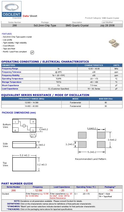 Oscilent晶振,266晶振,266-12.0M-20-S-TR晶振