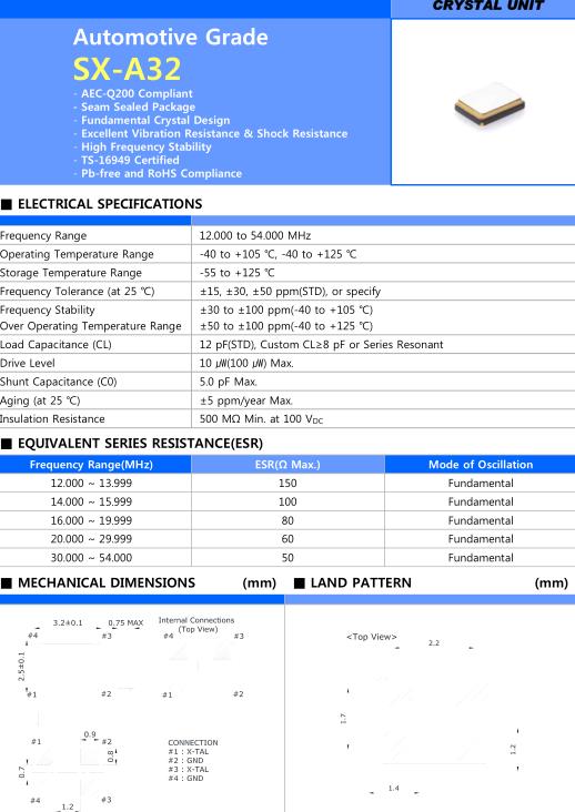 Sunny晶振,SX-A32晶振,SP10130M7–27.00000–T&R晶振,超小型表面貼片型SMD晶振,最適合使用在汽車電子領(lǐng)域中,也是特別要求高可靠性的引擎控制用CPU的時(shí)鐘部分.低頻晶振可從7.98MHz起對(duì)應(yīng),小型,超薄型具備強(qiáng)防焊裂性,石英晶體在極端嚴(yán)酷的環(huán)境條件下也能發(fā)揮穩(wěn)定的起振特性,產(chǎn)品本身具有耐熱,耐振,耐撞擊等優(yōu)良的耐環(huán)境特性,滿足無鉛焊接以及高溫回流溫度曲線要求,符合AEC-Q200標(biāo)準(zhǔn).