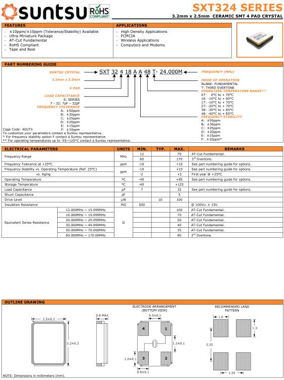 | Suntsu晶振規格 | 單位 | SXT324晶振頻率范圍 | 石英晶振基本條件 | |