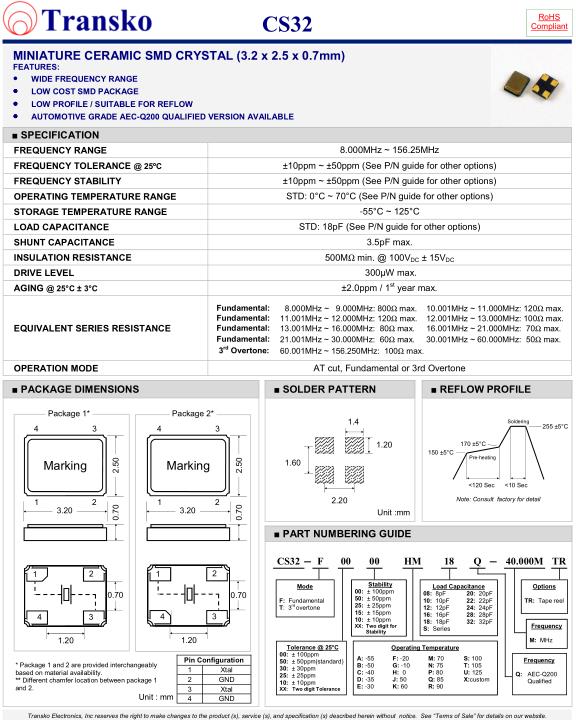 | SPECIFICATION-Transko晶振 | CS32晶振 |