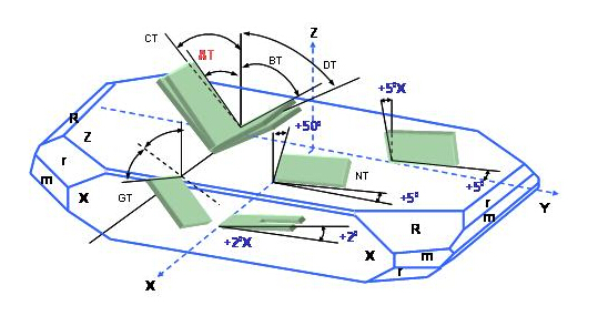 依據不同的應用領域及工作溫度需求, 因應了許多不同的石英切割角度種類. 例如AT-, BT-, CT-, DT-, NT, GT…..等不同的切割板片. 不同的切割方向的板片具有不同的彈性常數張量(elastic constant tensor), 不同的壓電常數張量(piezoelectric constant tensor)及不同的介電常數張量(dielectric constant tensor). 這些張量在石英組件的設計及應用上展現了不同的振蕩及溫度特性. (圖三)表現了在Z-plat石英結構上,幾種不同方向的石英板片切割方式.