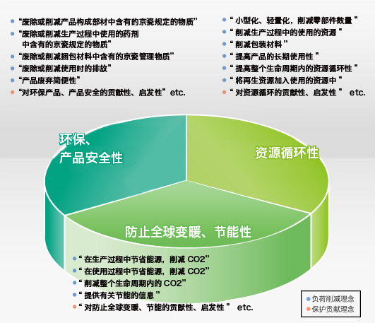 為進行環境友好型產品的設計,京瓷明確了“環境友好理念”.將對于防止全球變暖、節能、節省資源、削減有害物質做出積極貢獻的產品定為“環保商品”,并針對所有產品設定了以環境友好理念為基礎的評價基準.通過這些努力,在2014年度,環保商品的比例達到了99%.