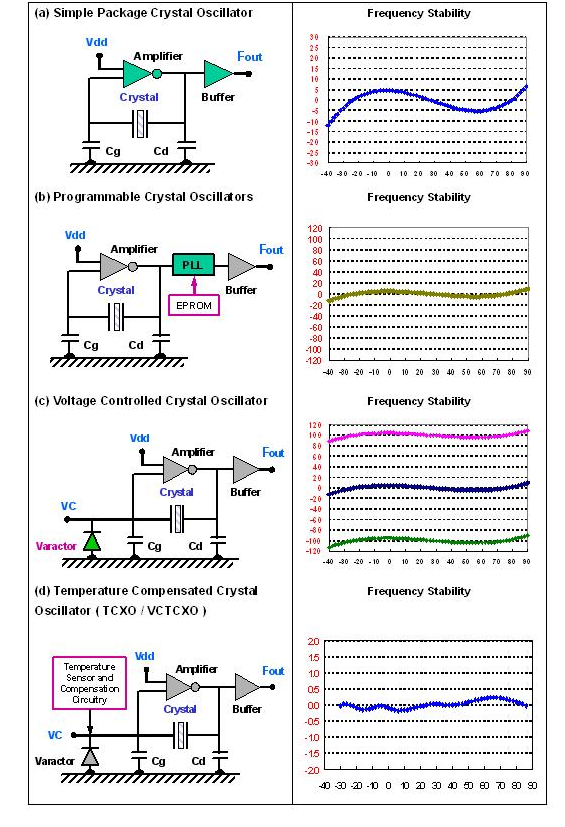 為了滿足應用面需求而言, 石英晶體振蕩器內部的振蕩線路有以基本波或三倍頻不同方式. 若要達到數佰兆赫的輸出頻率時, 振蕩線路后級可以采用鎖相回路方式或倍頻方式, 將較低頻率的石英振蕩頻率提升. 對于輸出端的輸出準位及輸出波形也有各類不同需求,如 CMOS, LVPECL, LVDS…..等. 這些規格都要仔細的定義.
