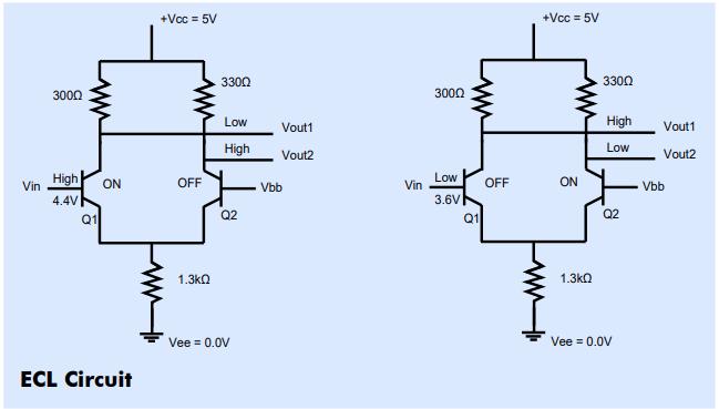 輸入高電壓和低電壓由電源電壓、基極電壓和發(fā)射極電壓值定義。在這個(gè)例子中,Vcc=5V,Vbb=4V和Vee=0V。這使得高和低的輸入值分別為4.4V和3.6V。